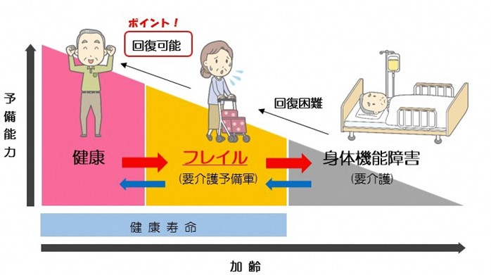 まず“フレイル”とは、高齢になって心身の活力(筋力、認知機能、社会とのつながりなど)が低下した状態をいいます。