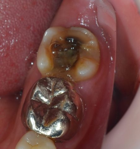 白くなっている所が銀色の被せ物でそのすぐ下側に黒くなっている部分が虫歯になっている箇所です。