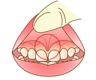→人間の口には4つの「小帯」と呼ばれる筋があります。舌の下、両側の頬と歯茎の間、上唇と歯茎の間です。この中でも上唇の裏にある上唇小帯は、歯磨きをしている時に歯ブラシが強く当たり痛みを感じることがあります。仕上げ磨きをするときはこの上唇小帯を指で守りながら磨きましょう。